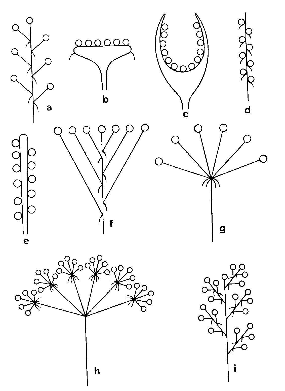 Fig.10: a. tros; b. hoofdje; c. bloemkoek; d. aar; e. bloeikolf; f. schermvormige tros; g. scherm; h. samengesteld scherm; i. samengestelde tros