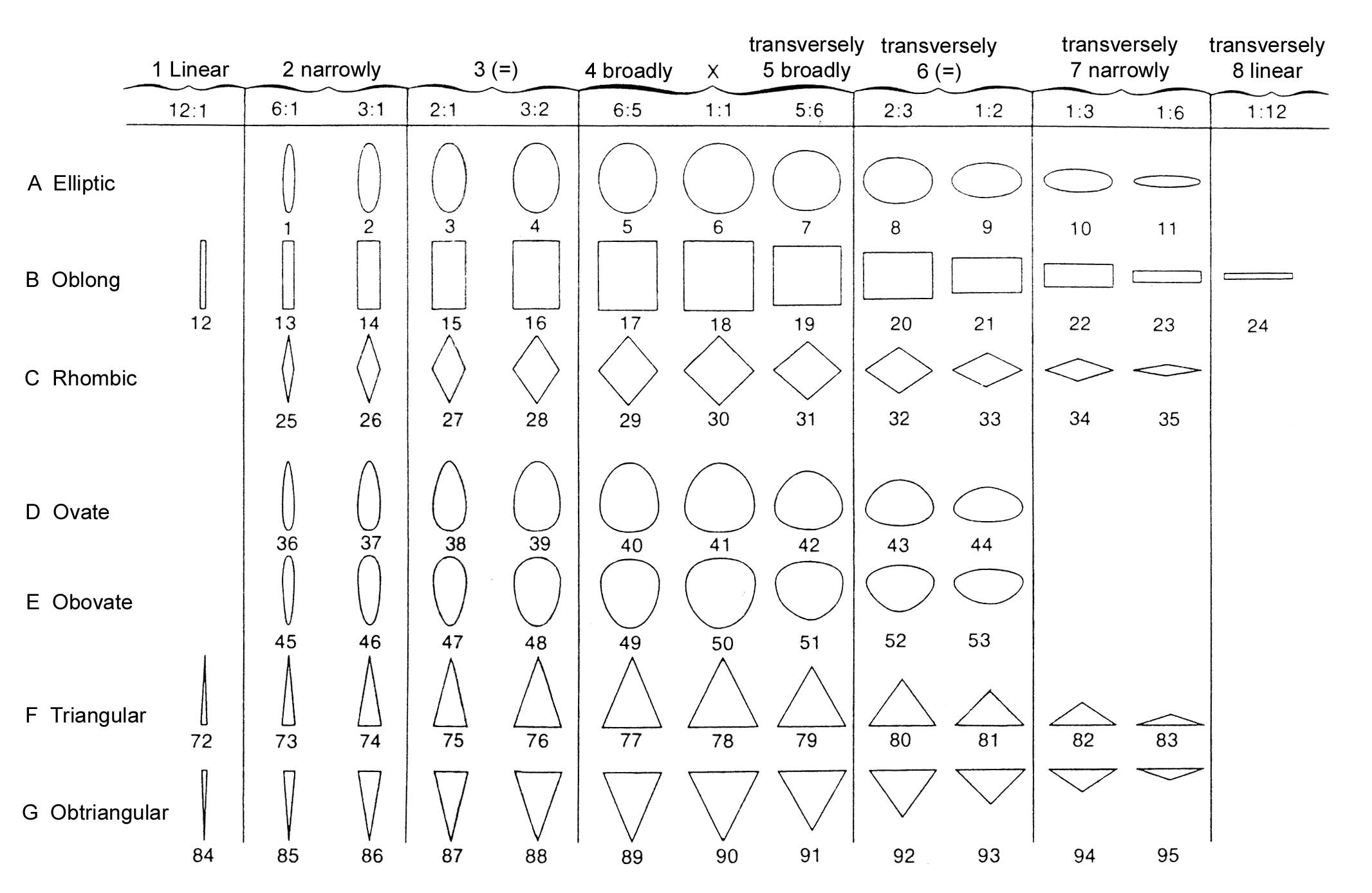 b (verhouding l:b<=2:1): 1. omgekeerd eirond (obovate); 2. elliptisch (elliptic); 3. eirond (ovate); 4. driehoekig (triangular);