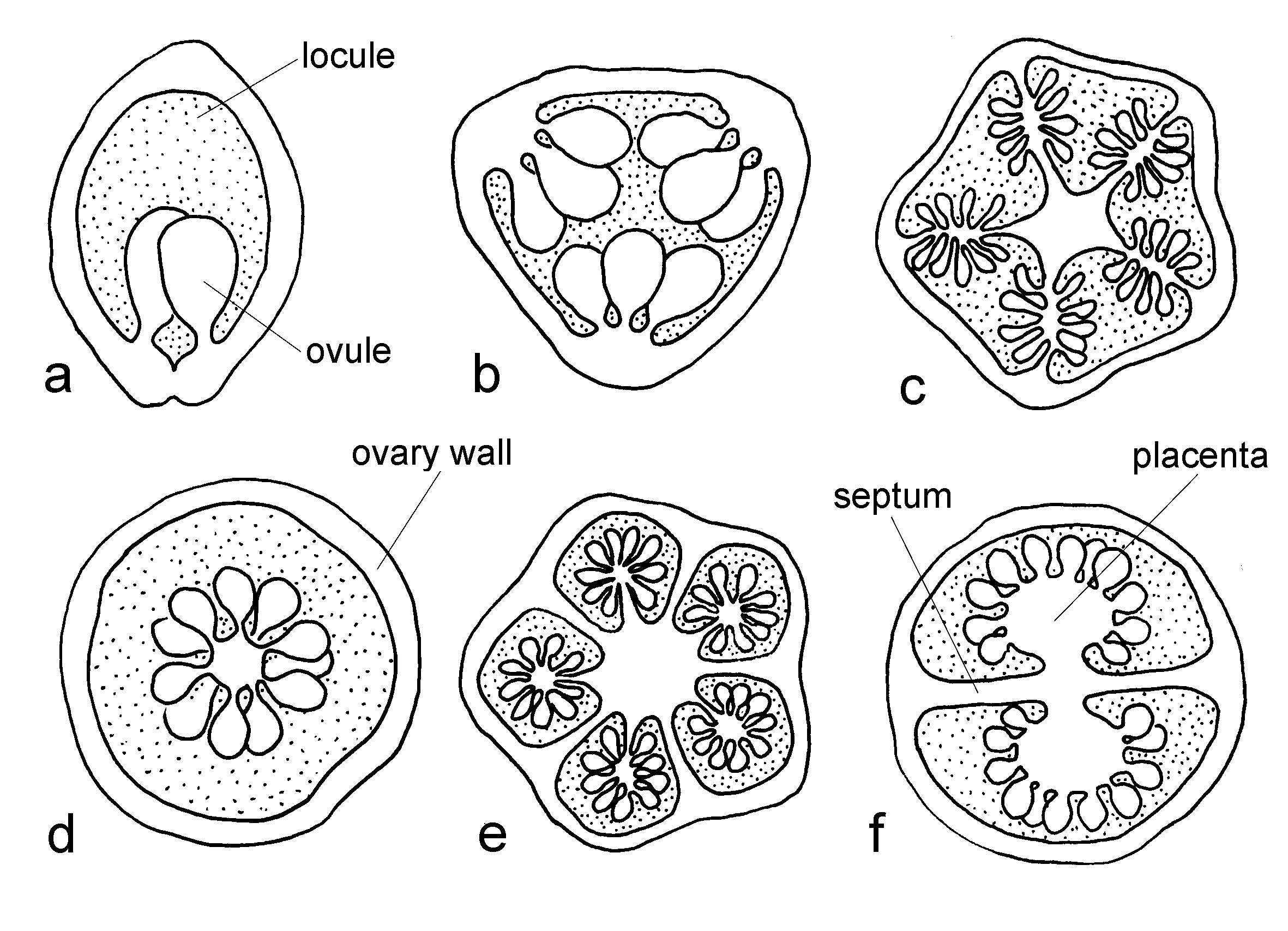 Fig.15, vruchtbeginsel / placentatie: a. - marginaal (1-hokkig); b. - wandstandig (parietaal, in 1-hokkig, samengesteld vruchtbeginsel); c. - laminaal (5-hokkig); d. - centraal (1-hokkig); e. - hoekstandig (5-hokkig); f. - hoekstandig (2-hokkig)
