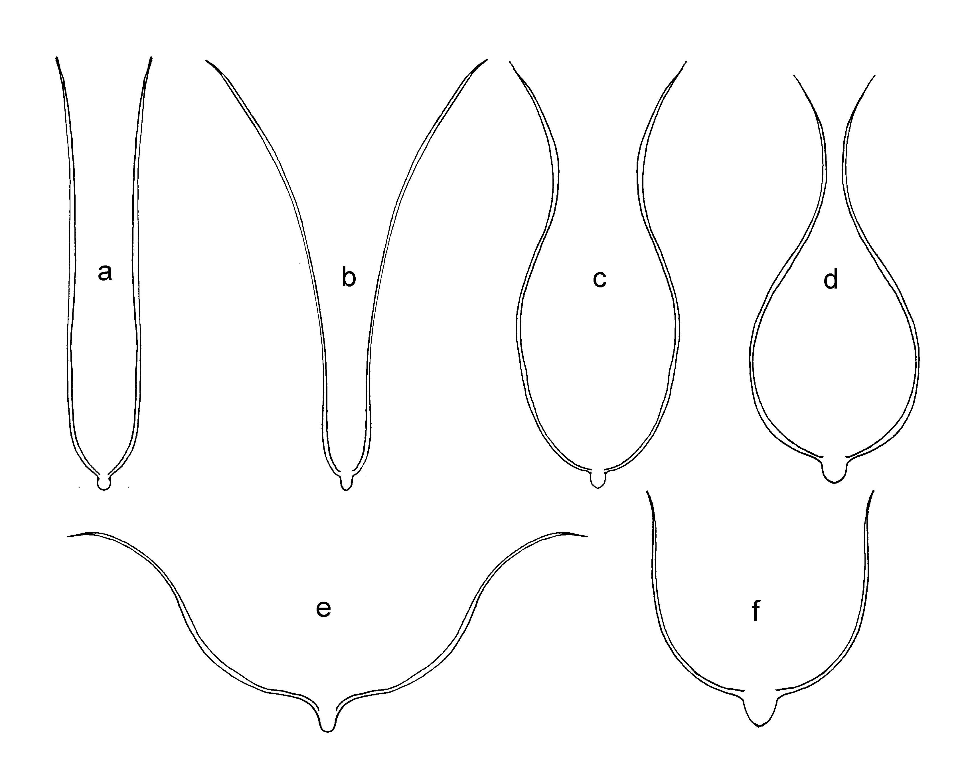 Fig.16, bloem / rozet vormen: a. tubevormig (tubular); b. trechtervormig (funnelform); c. urnvormig (utriculate); d. opgeblazen, bolachtig (bulbous); e. kratervormig (crateriform); f. bekervormig (cyathiform)